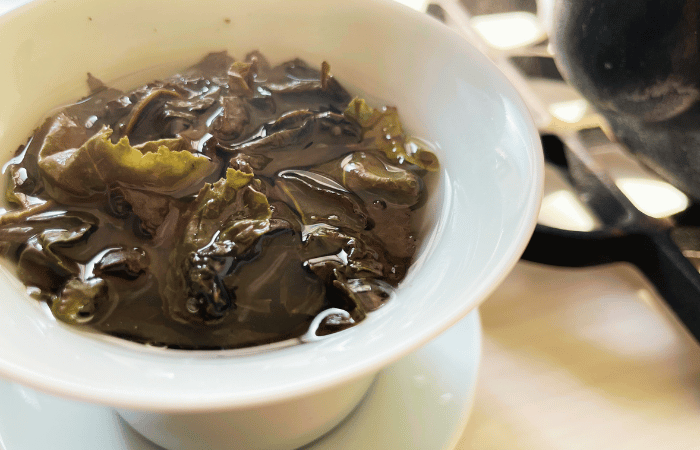 蓋碗に湯を注ぐと、茶葉の香りが一気に解き放たれます。