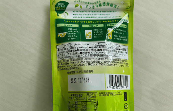 | リプトン フレッシュグリーンティー | 14袋(328円) | 約23円 | 約2.8L | 手軽・香り爽やか |