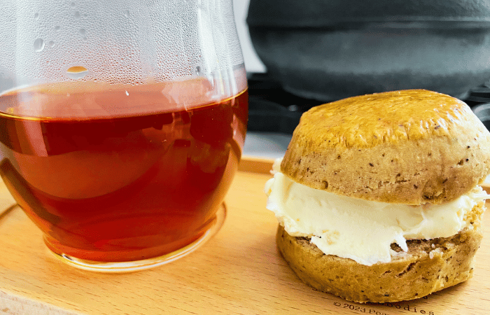 - 紅茶の香りと舌触りを嗜みつつ、スコーンのちょっとパサっと感にクロテッドクリームをあわせて甘味を足せば、紅茶と最高のマリアージュに。